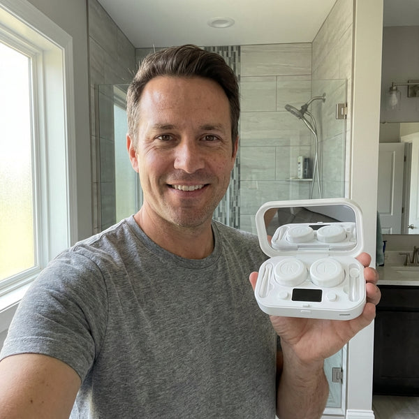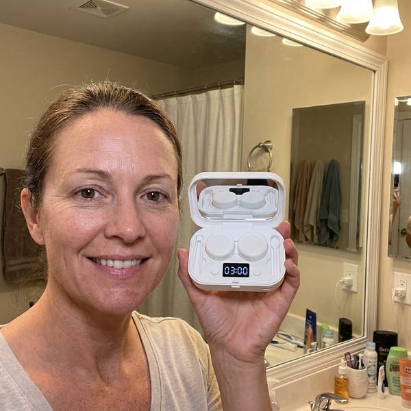 It’s easy to use. Just put your lenses in the little case, add your normal cleaning solution, press the button, and wait about 2–5 minutes. That’s it! Your lenses come out super clean and feel like new.